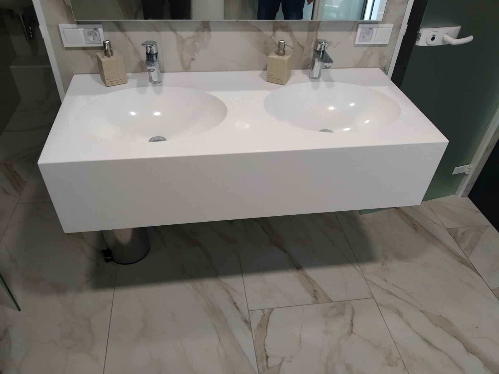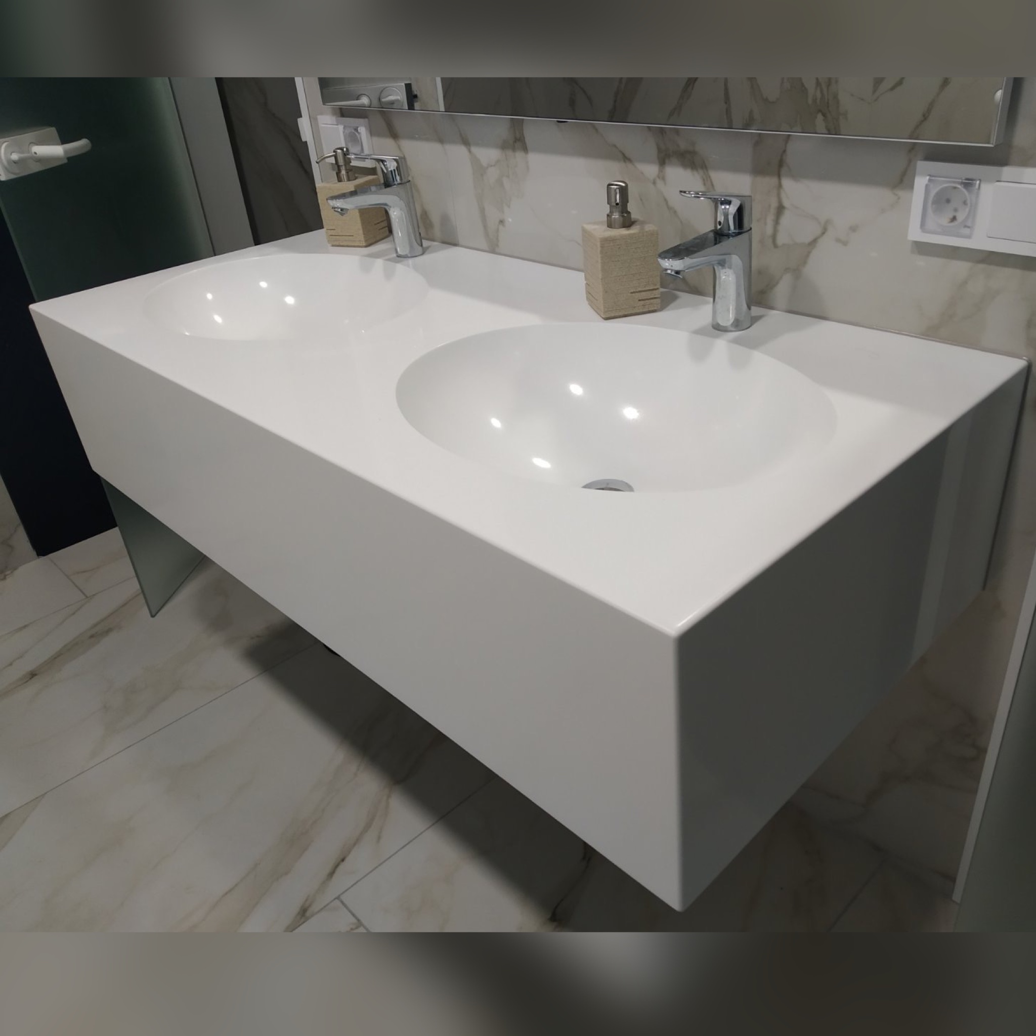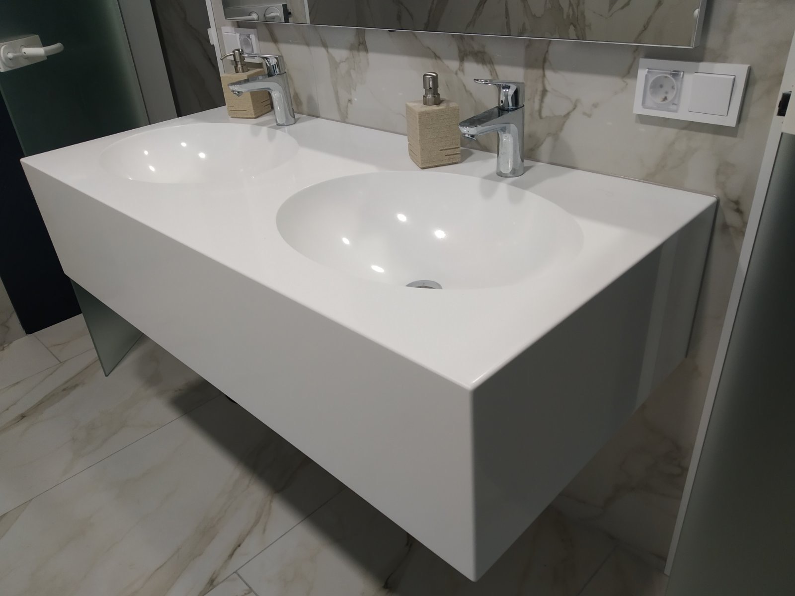 Белая столешница из акрилового камня с двумя встроенными мойками