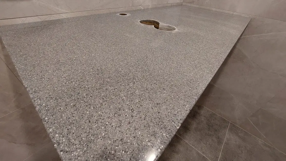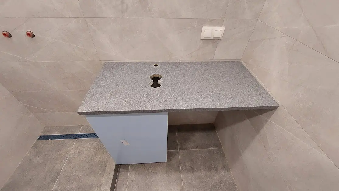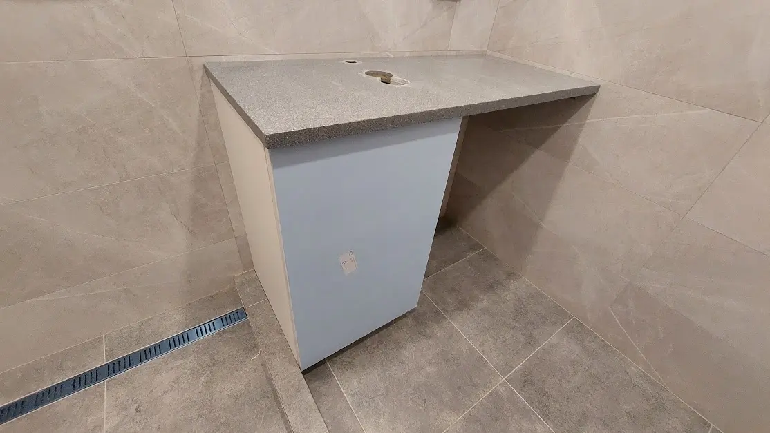 Белая столешница из акрилового камня с двумя встроенными мойками
