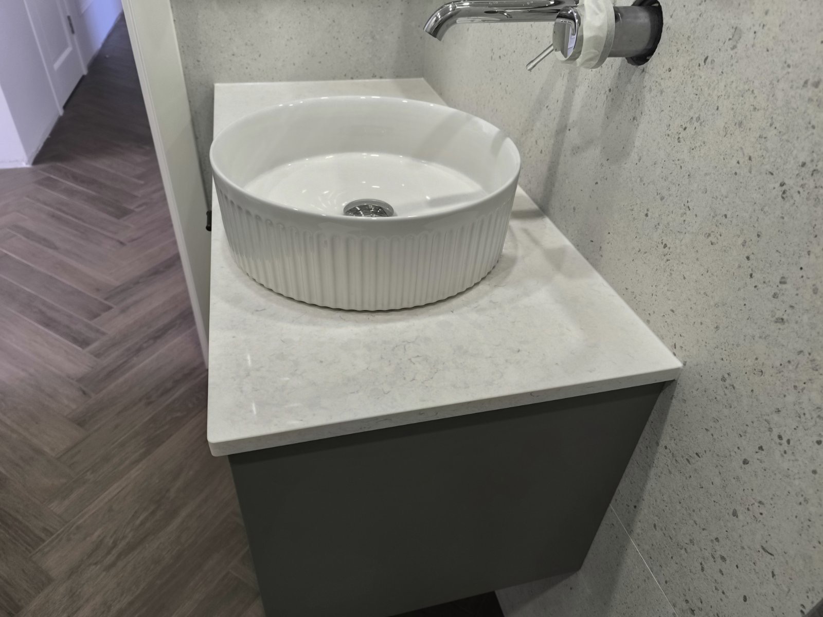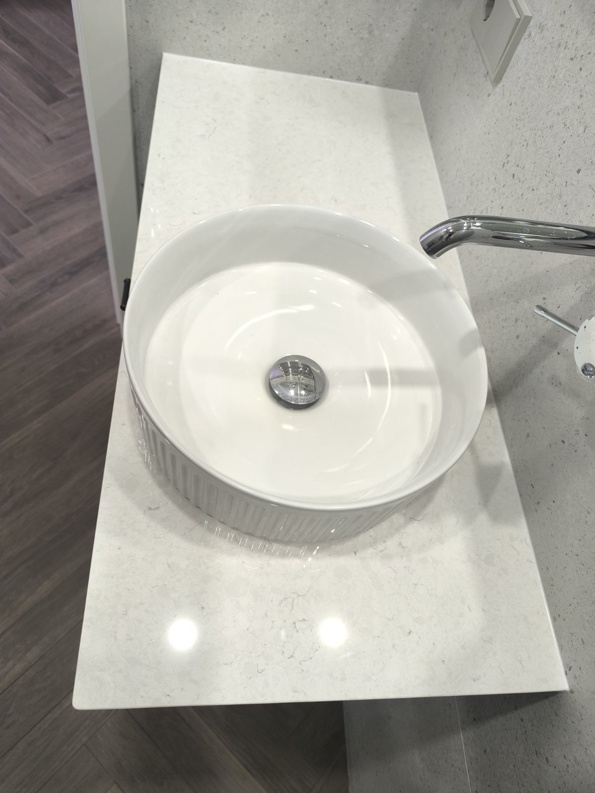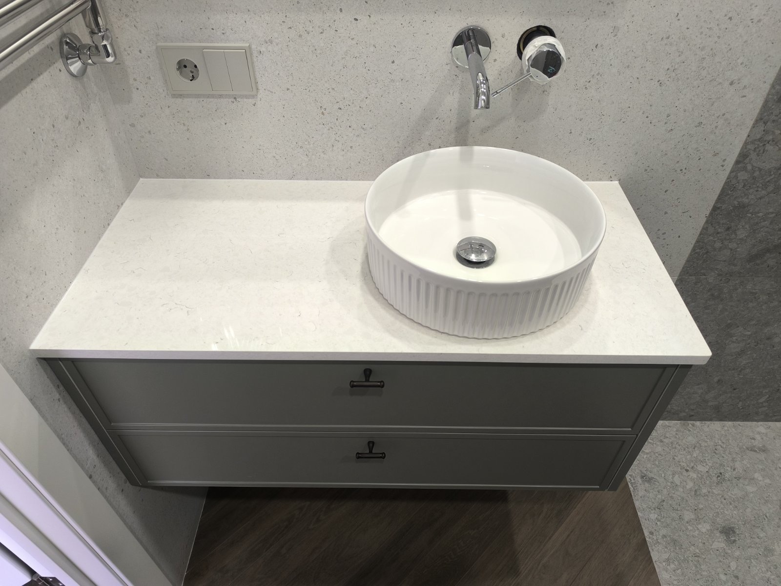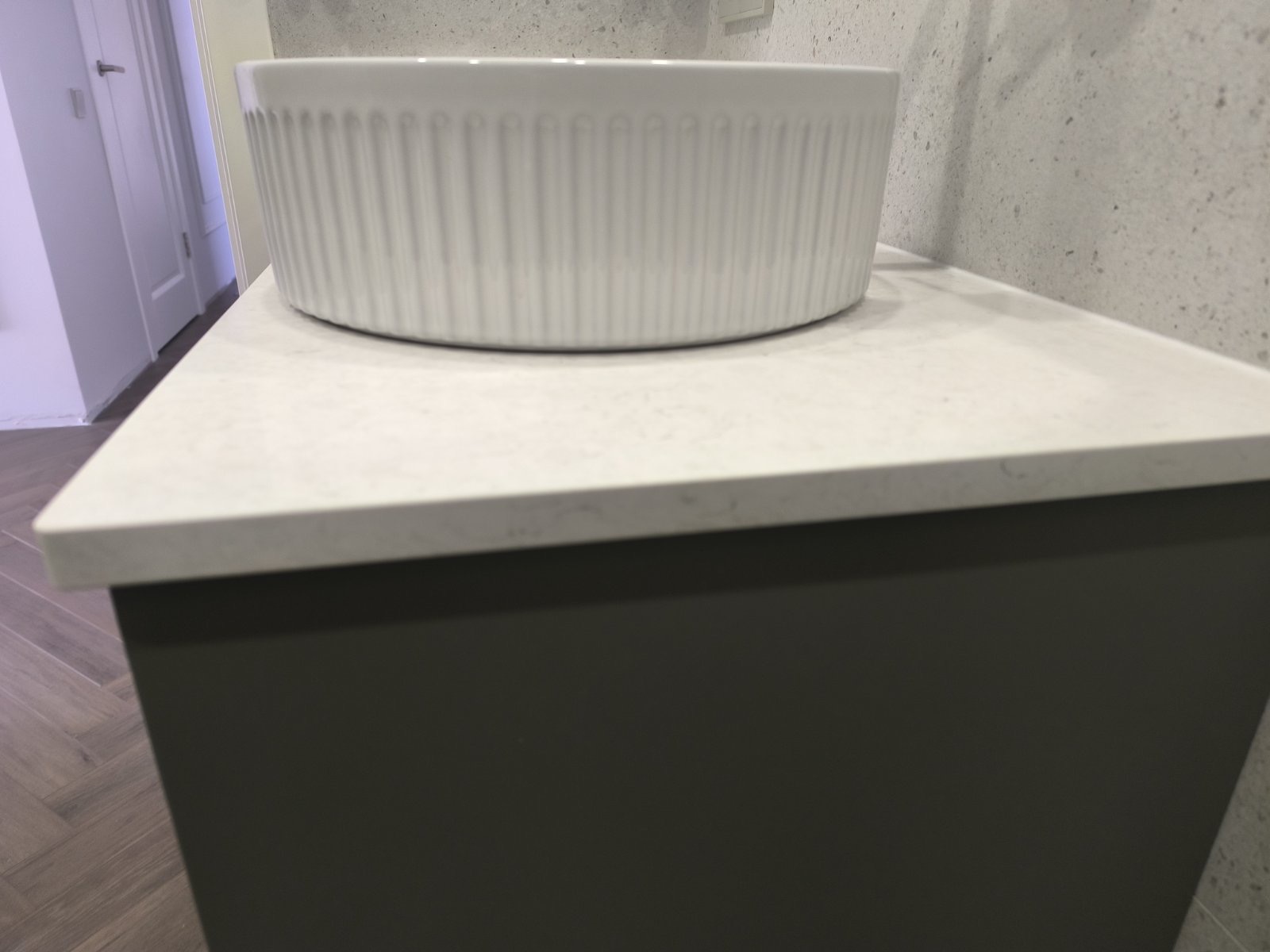 Столешница кварцевый агломерат с накладной чашей выполнена из бренда камня Аварус R543 Пик Эльбруса